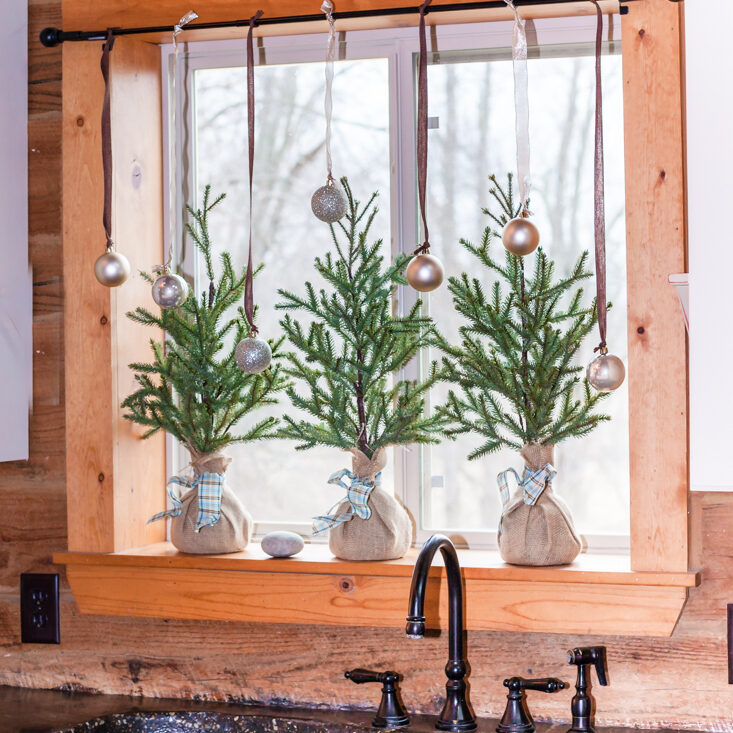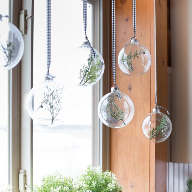 Per gli amanti della natura, questo davanzale è quello che fa per voi! Riempi grandi ornamenti di vetro con rametti, vanno bene anche rametti di rosmarino e appendili ad un nastro di tua scelta per creare un davanzale davvero unico.