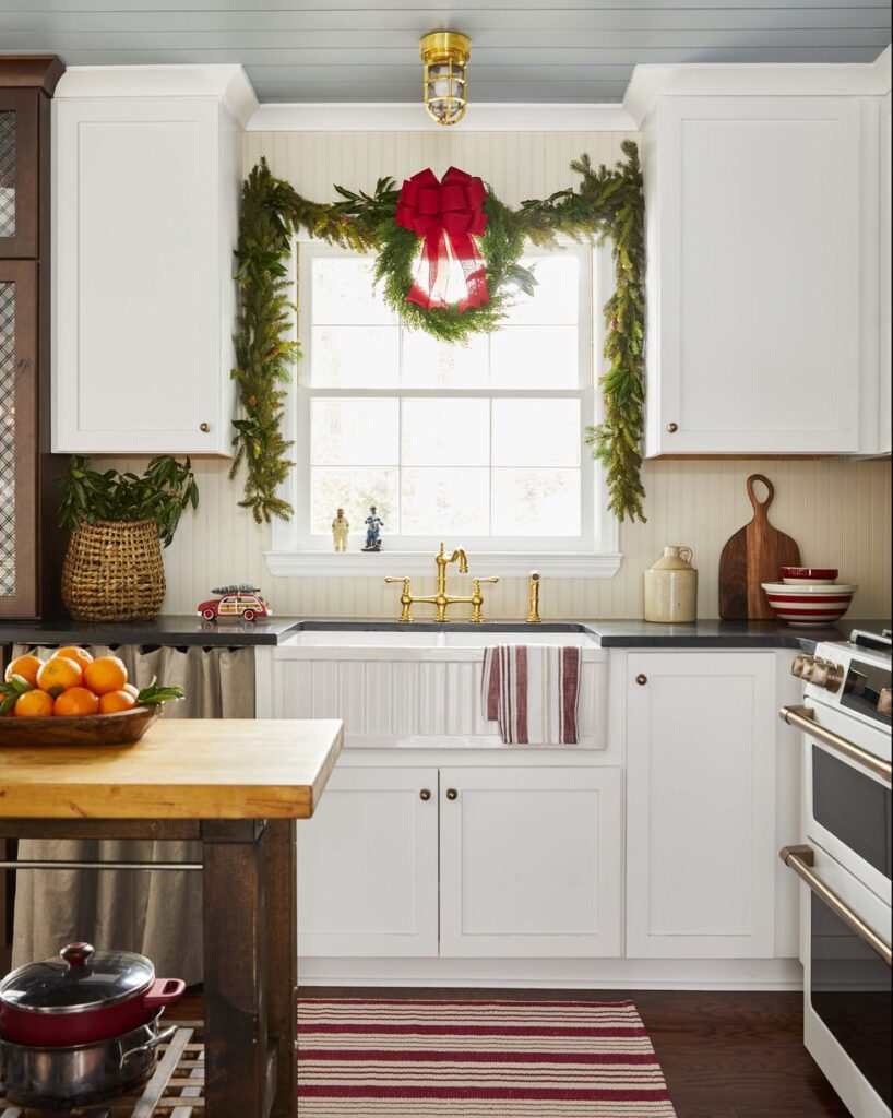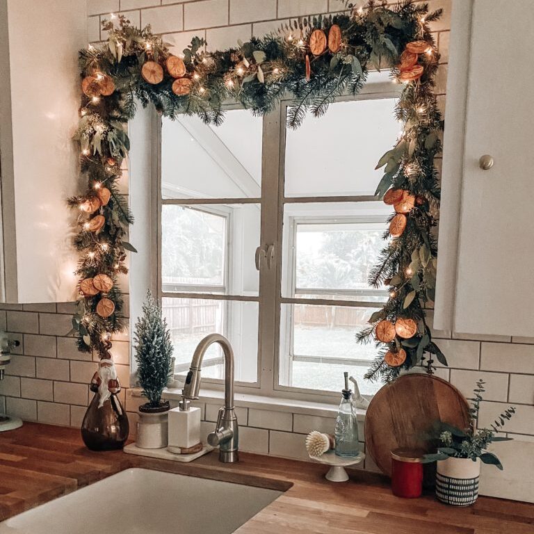 Il tuo arredamento natalizio non deve essere limitato al rosso e al verde. Aggiungi le arance secche a una ghirlanda che incornicia le finestre per un tocco di colore inaspettato.