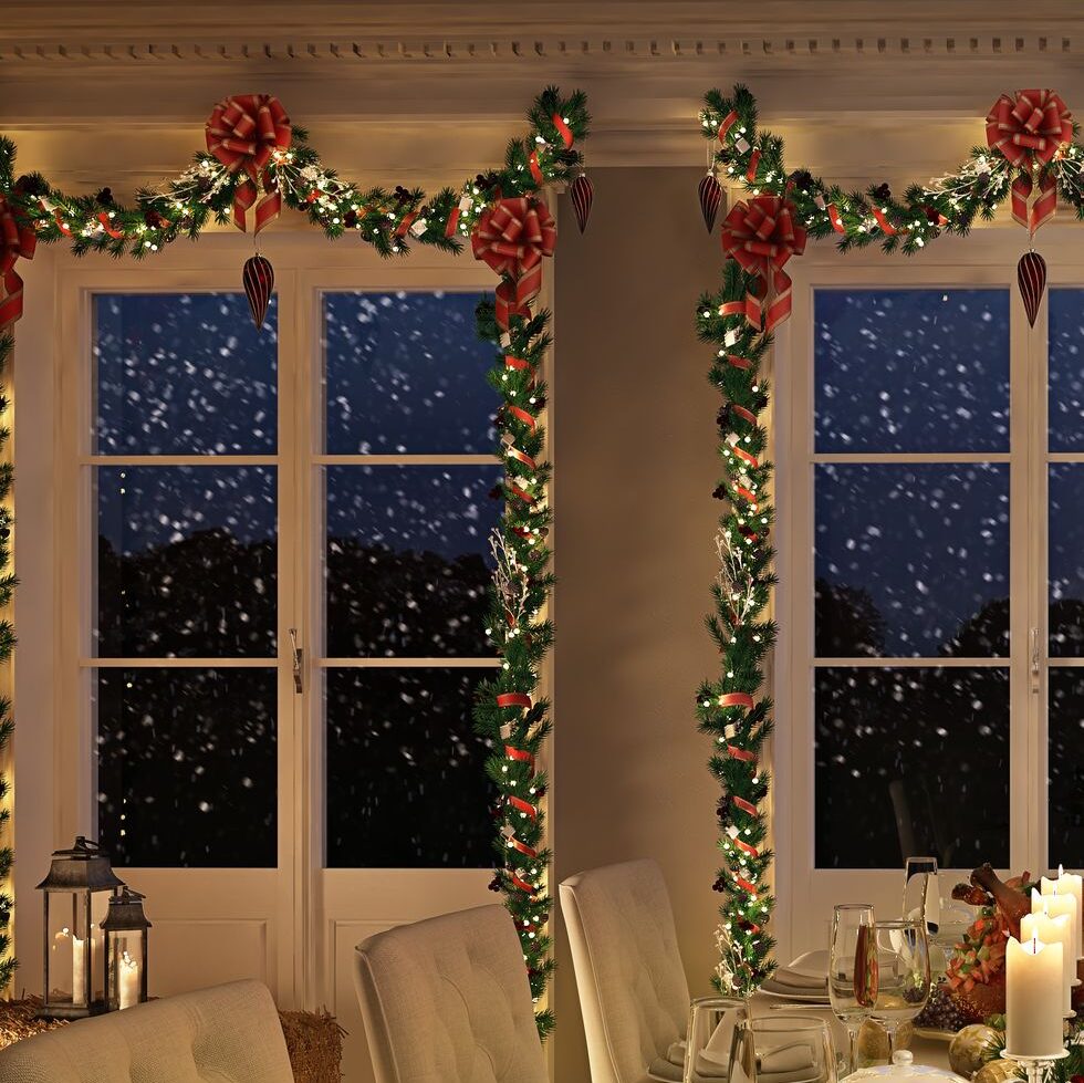 Incornicia le tue finestre con una ghirlanda pre-illuminata adornata con nastri rossi per portare una magica atmosfera nelle tue giornate natalizie. Una decorazione suggestiva e di sicuro effetto.