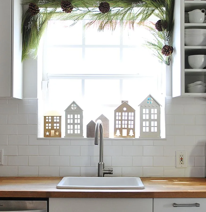 Davvero deliziose le file di casette appoggiate sul davanzale della finestra, il tutto ravvivato da una ghirlanda posta in alto. Preparare queste casette è molto semplice, basta disegnare su un cartoncino le figure e ritagliarle. Mentre la ghirlanda può essere acquistata ovunque, qui la trovi in offerta.