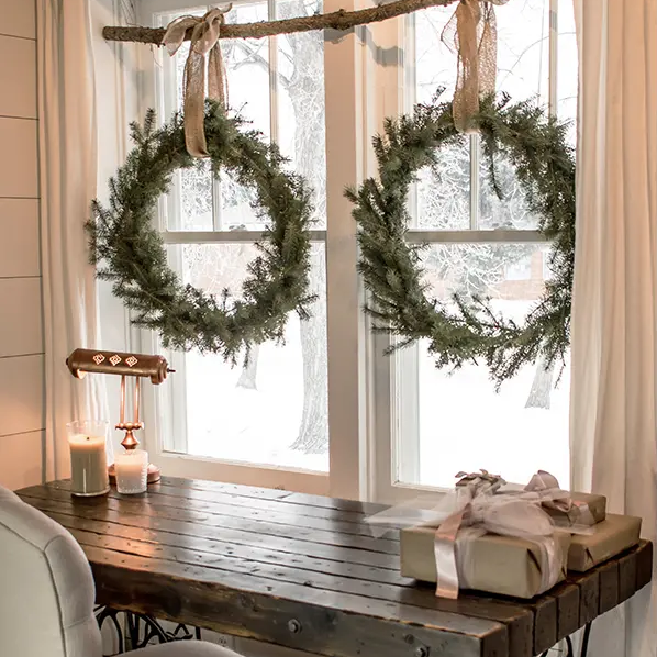 Usa un ramo caduto come appendiabiti rustico e del nastro tipo rafia o nastro rosso per sospendere semplici ghirlande di pino nel telaio della finestra.