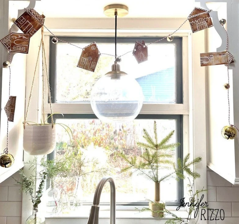 Se la ghirlanda tradizionale non fa per te, puoi provare ad incorniciare la tua finestra con delle deliziose mini case di pan di zenzero e campane d’oro su spago da fornaio.